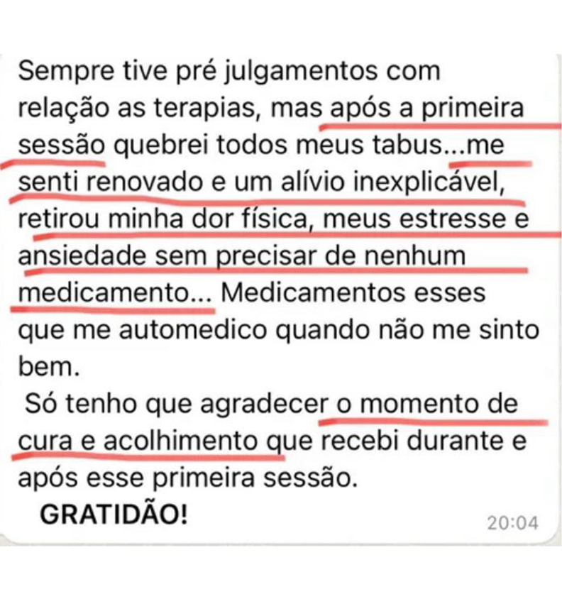 Os pacientes relatam sensação de bem-estar, alívio, leveza, sentimento de paz e vontade de viver já nas primeiras sessões.