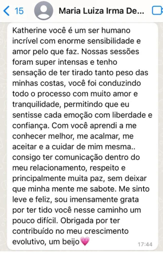Katherine gosta de trabalhar de maneira holística, holística é derivada do grego “holo” e que significa completo, inteiro. É um conceito que valoriza a totalidade das coisas, onde tudo está interligado, ou seja, você é um ser que possui corpo, mente e espírito e todas as suas partes precisam estar equilibradas para que você consiga se sentir bem e conectado com a sua essência, ou seja, com quem você é de verdade, com quem você nasceu para ser conforme a vontade de Deus e por algum motivo se perdeu de si mesmo.